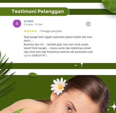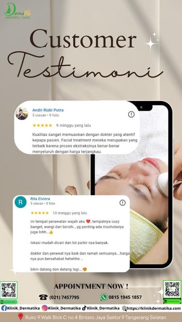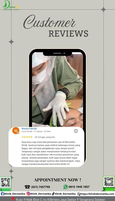 ❤️ Fokus pada Hasil Nyata & Edukasi : Tujuan kami adalah kesehatan kulit jangka panjang Anda. Selain memberikan perawatan efektif dengan hasil yang tampak alami, tim kami juga akan mengedukasi Anda tentang cara merawat kulit dengan benar di rumah. Kami adalah partner Anda dalam perjalanan menuju kulit sehat.