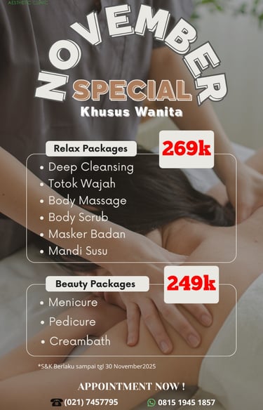Layanan Relaksasi atau Spa (khusus wanita) menawarkan fasilitas ruangan privat (private room) dan ditangani oleh terapis yang berpengalaman dengan layanan perawatan Spa yang diminati seperti Hot Stone Massage, Totok Wajah, Hair Spa, Lash Lift dan masih banyak ragam layanan relaksasi yang membuat badan lebih sehat dan segar.